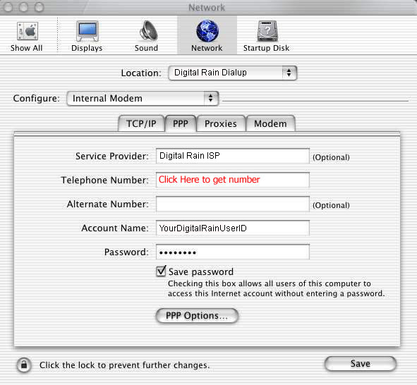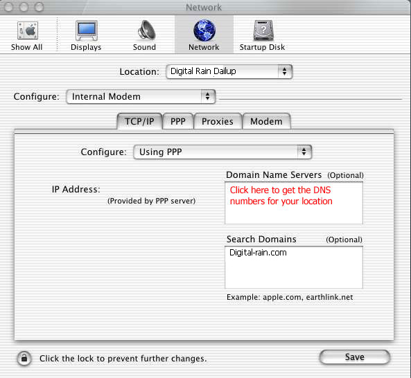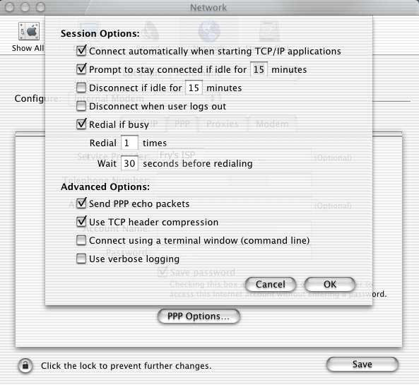 built-in modem, Modem: should be set to Apple Internal 56K Modem